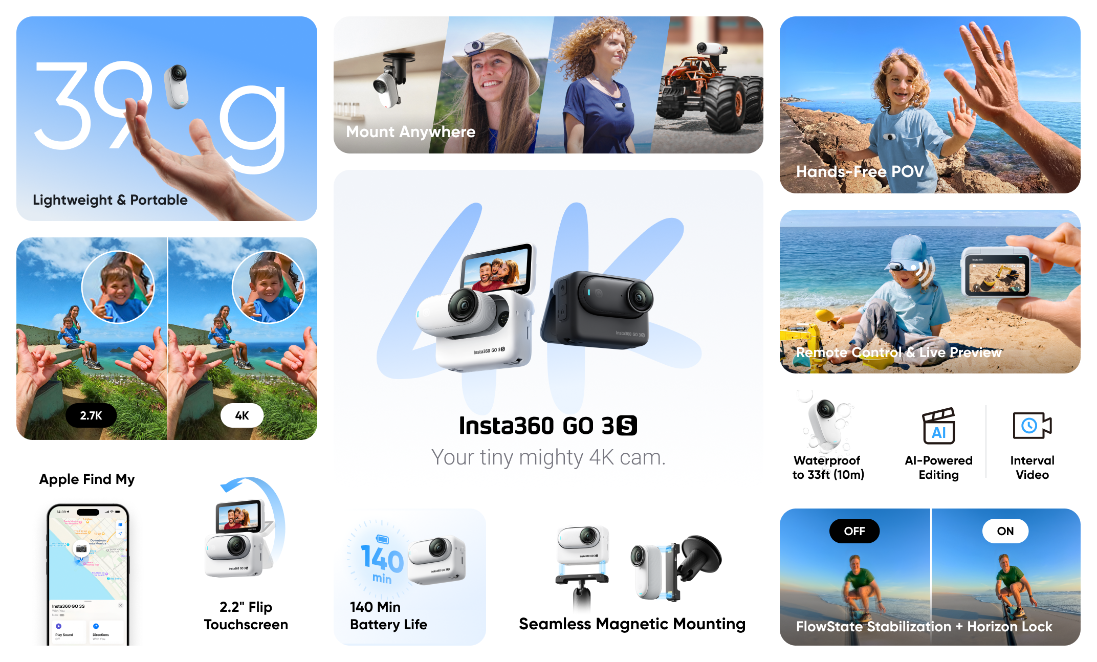 Powered by an enhanced chip with 50% more CPU computing power and a new wide-angle lens, GO 3S now shoots in stunning 4K. It offers nearly double the amount of pixels compared to 2.7K to capture every moment of life in sharp, clear detail.